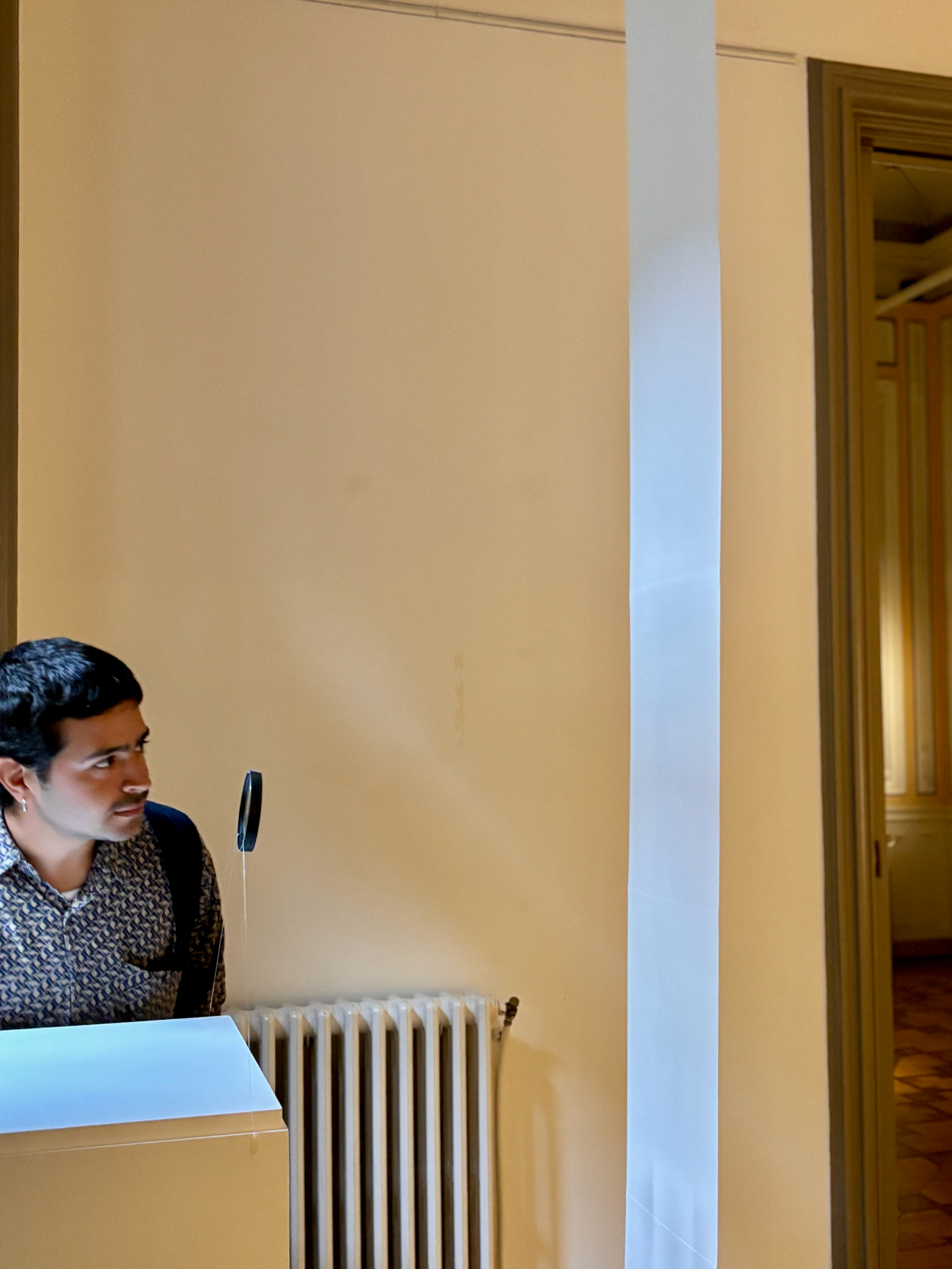 Installation Variable dimensions (Through the window of the Carme Biada room, Casa Elizalde) This installation is positioned in front of one of the room's windows, where the light from outside and the view beyond are visible on the paper only through a magnifying glass that acts as a lens. Through the process of optical refraction, the depicted scene appears inverted, creating a composite image of the environment beyond the exterior of the house. Light manifests itself as the element that activates the poetics of the work, revealing a changing image to the rhythm of its movement, of suspended time, and the dynamics of optics. The title of the work refers to the exact spatial coordinates of the site where the installation is presented, anchoring the visual experience in a specific location on the map. The intention of the work is to explore the nature of human perception and the notion of image, grounded in the existence of light and its direct relationship with the space in which it unfolds.